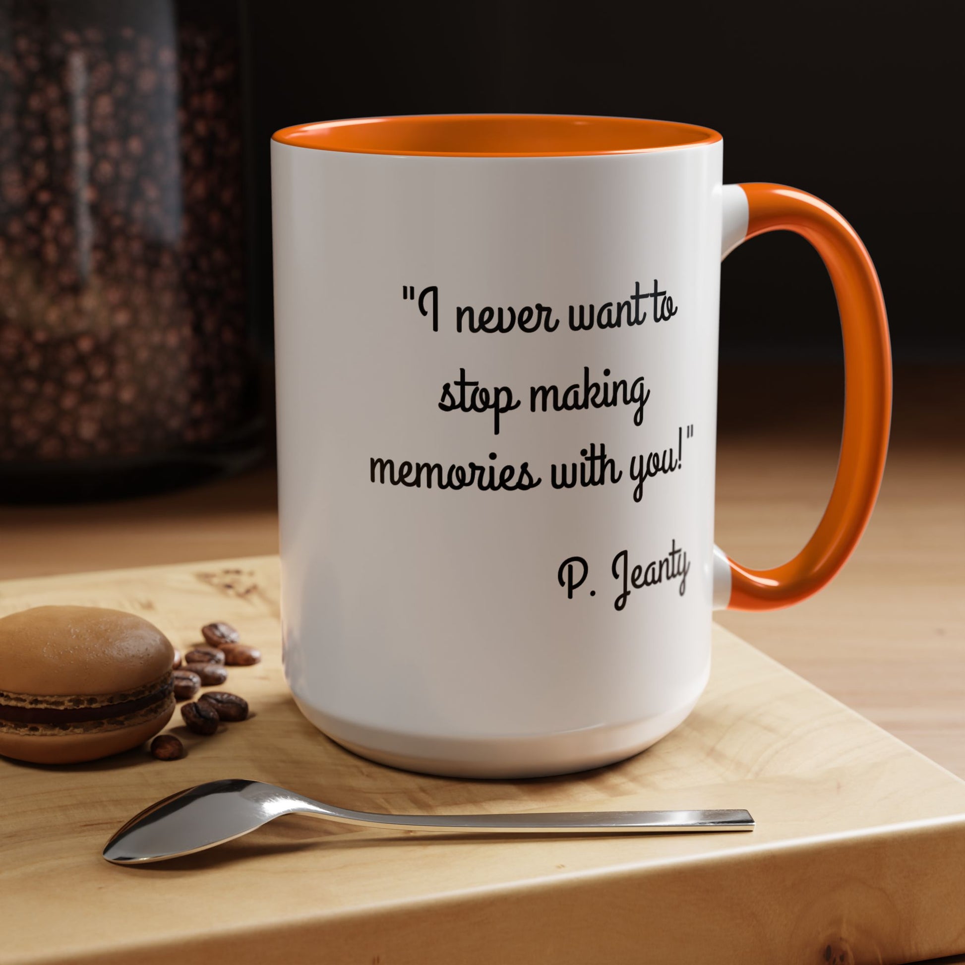 Bright, two-toned ceramic mug that turns everyday coffee into a quiet moment of connection. The glossy white exterior pairs with a bold colored interior and handle, framing a handwritten-style quote that reads like a note from someone who loves being present. Warmth gathers in the palm as the black rim and handle create a gentle contrast against the clean white canvas. It’s the kind of mug that sits on the table during slow mornings, on the desk during late-night planning, or by the sink after an honest conversation spilled over. You’ll reach for it when you want comfort and a small reminder that memories are being made.